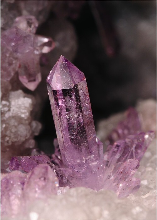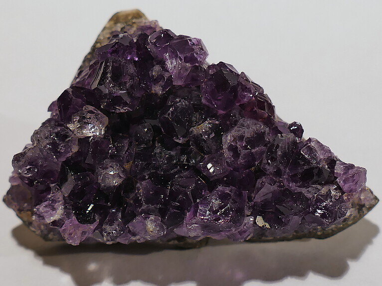 這時,地殼中富含的硅也加入了舞臺,它們在古老的岩石中悄然沉積,等待着大地的呼喚。在漫長的地質歲月裏,富含硅酸鹽的溶液在地底的深處緩慢流動,在遇到水分子(H₂O)後逐漸冷卻結晶,形成了晶瑩剔透的石英晶體。成爲了大家口中的“水晶”。而當這些石英晶體中混入了微量的鐵離子(Fe²⁺或Fe³⁺)後,在特定的地質條件下,鐵離子的價態變化使得晶體呈現出迷人的紫色,才造就了今天的主題:紫水晶。
