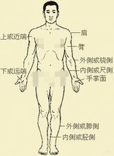 我們以身體直立,雙足併攏且平行,雙臂下垂,掌心向前向前爲解剖學姿勢,一切的方向概念都以這個姿勢爲基礎。靠近心臟所在的方向爲內、也叫向心。