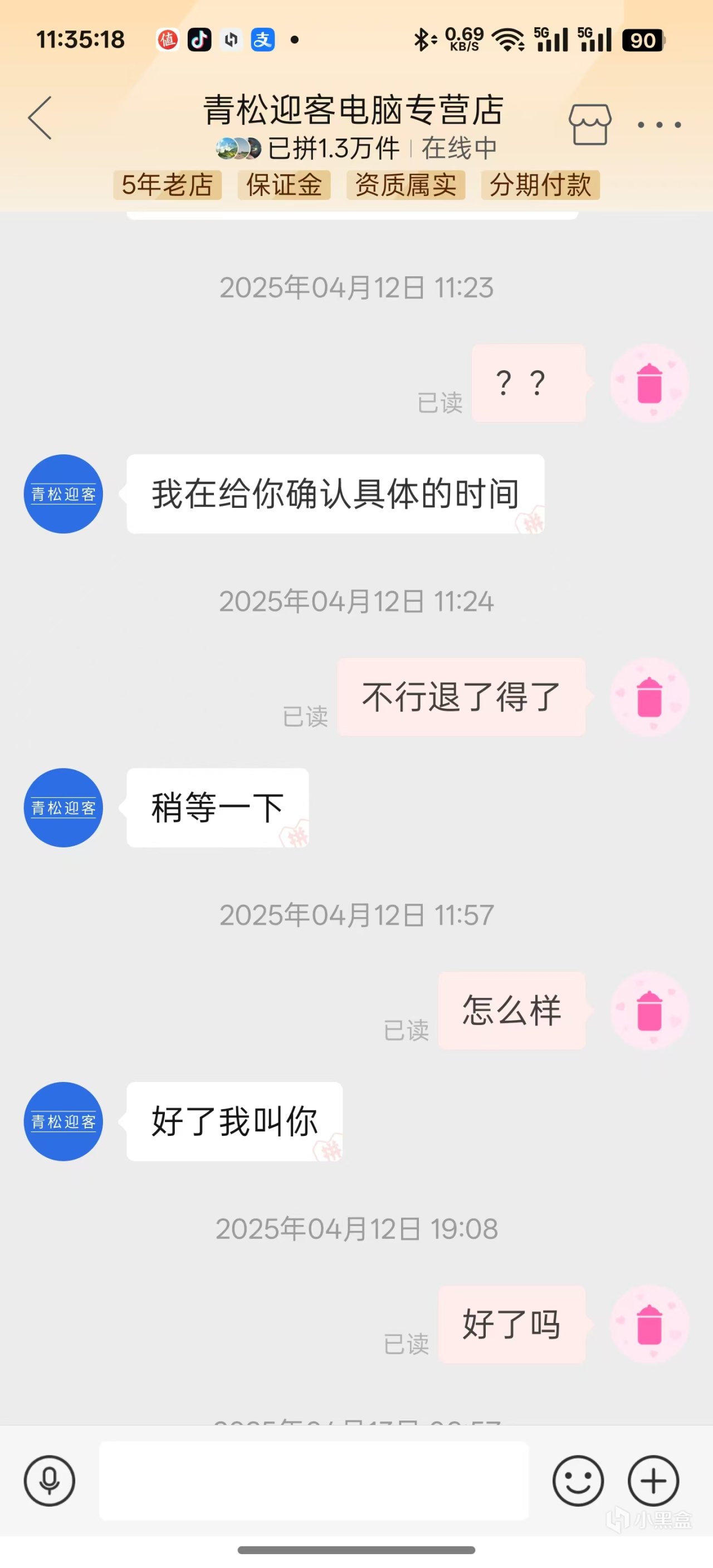 4.12我又去问商家什么情况,商家说还得确认情况具体时间(这个时候我已经开始想要退款了,等太久了)