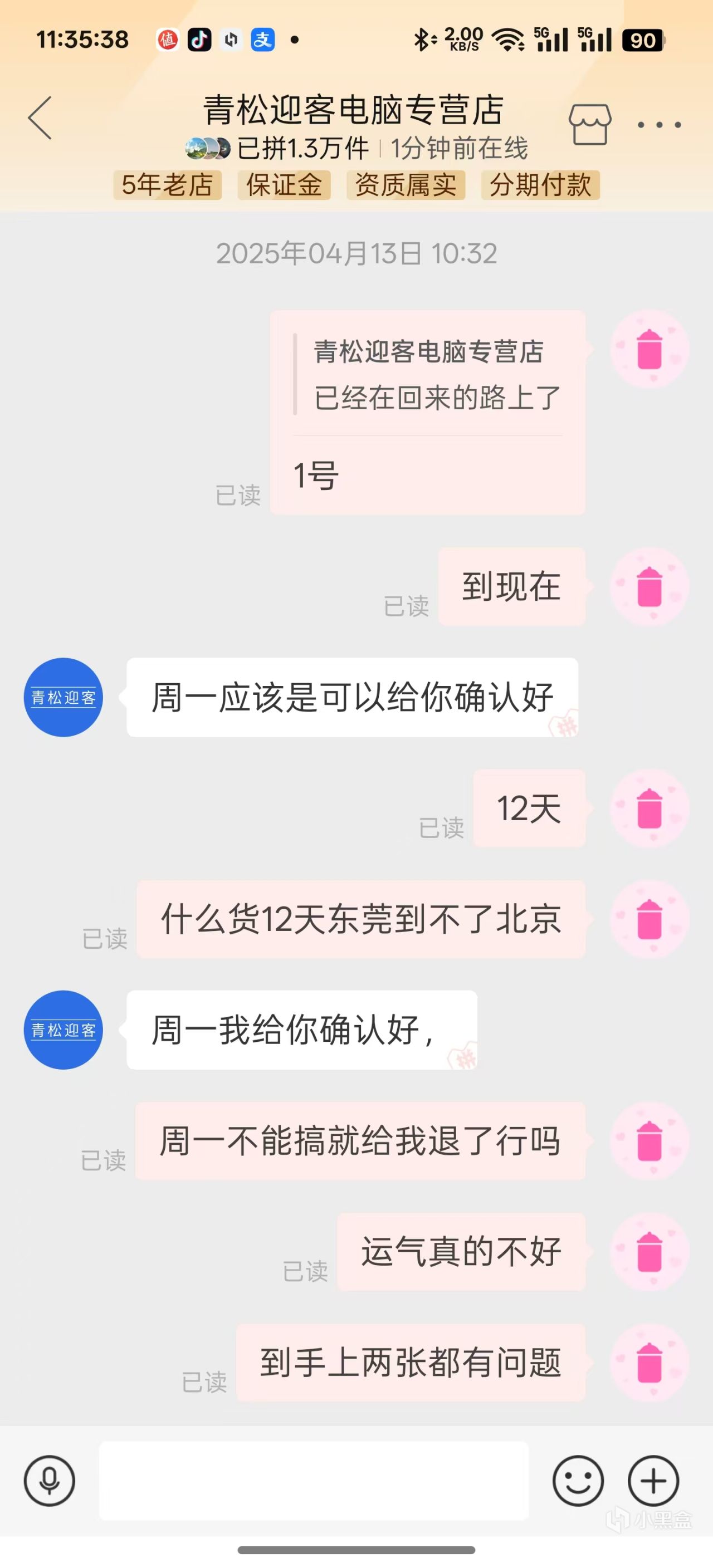 4.13商家说周一(4.14)能给我确认好,这个时候我已经开始生气了,因为他说了4.1已经在回去的路上了,理论上东莞到北京用不了十几天吧