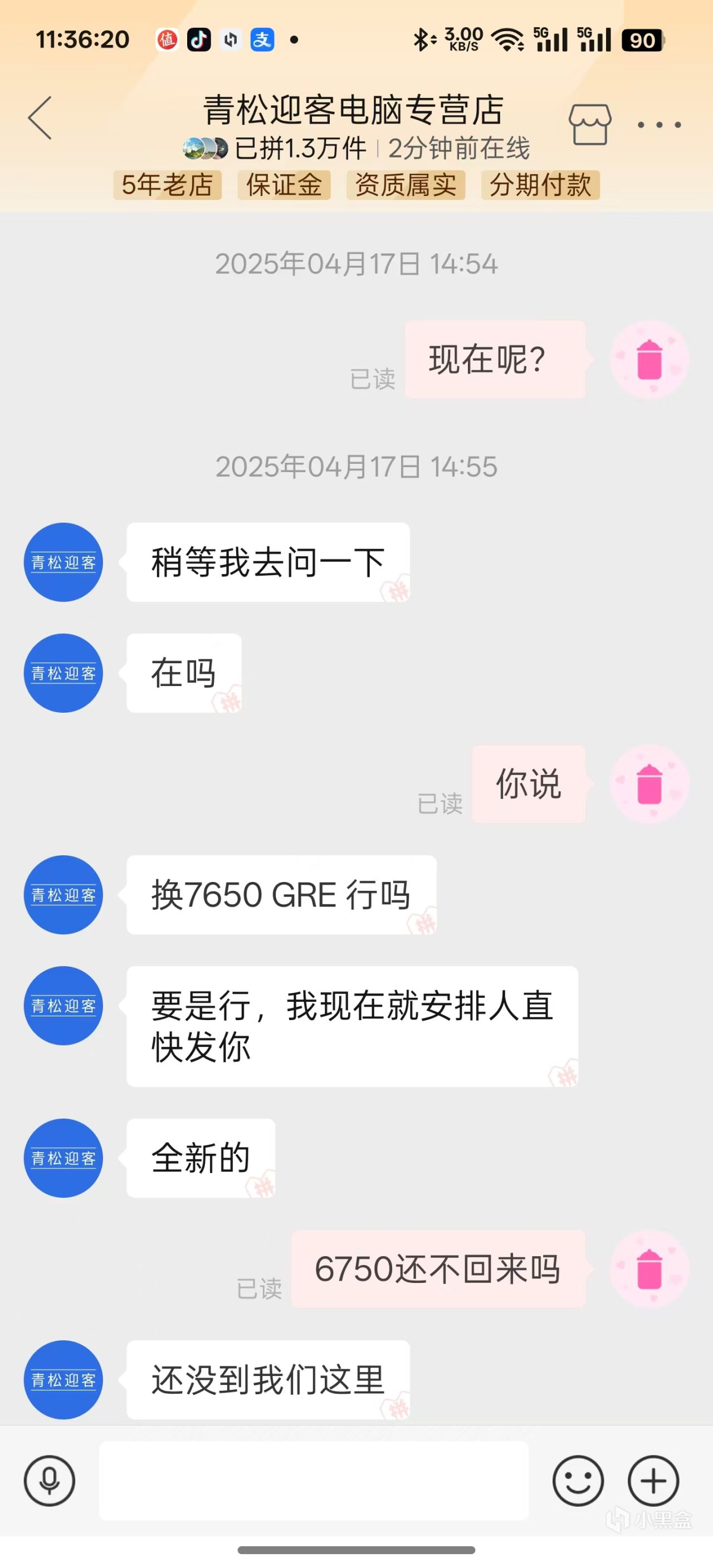 4.9号我还没有收到显卡,我想寻思应该也快到了,我就去问商家还要多久可以到,商家告知我一周内会给我发走。我还是怕换新回来还是有问题,商家说如果不行的话给我换个7650GRE(反正都等那么久了再等等得了)