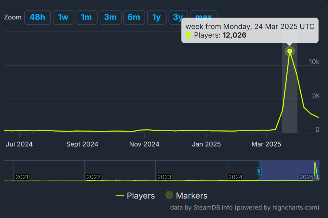 自从上个月末DLC发售,这游戏的在线人数就突然开始冒尖,变成了常熟阿诺的形状。