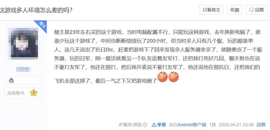 贴吧老哥们的经历带着几分滑稽,不过游戏过程中的爱国行径,也确实是类似题材游戏的经典问题。