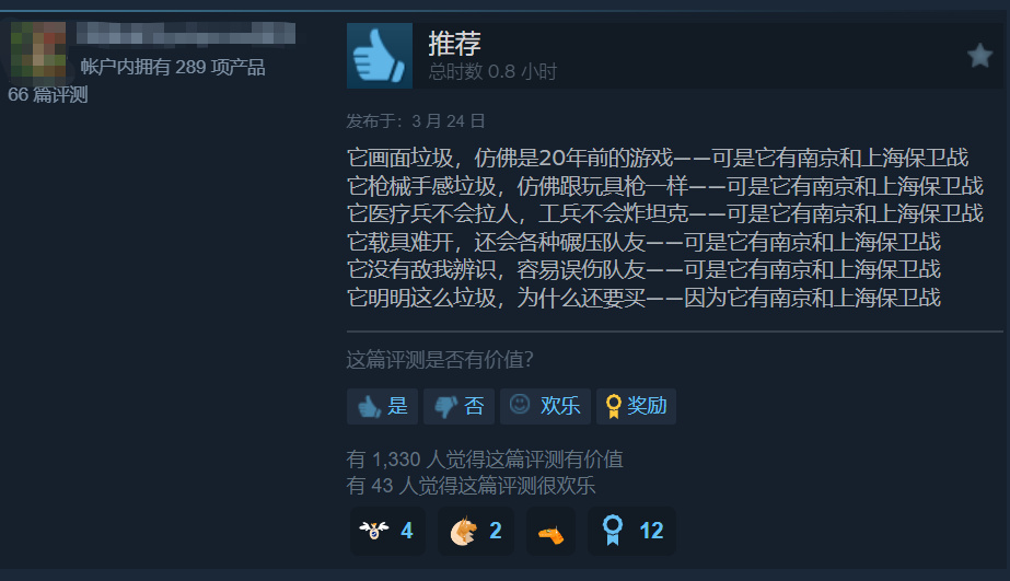 而单单从这个新DLC的玩家反馈来看,“淞沪会战+南京保卫战”确实让《易红2》小火了一把。