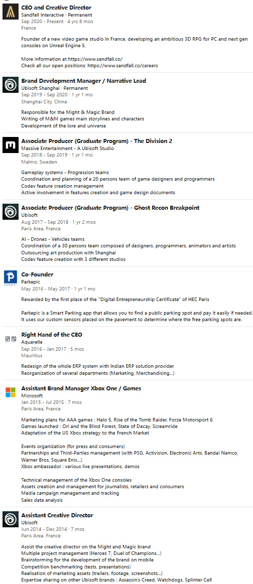 自2014年進入遊戲行業以來,他曾在育碧擔任創意總監助理、製作人助理和品牌開發經理,參與過《幽靈行動:斷點》《全境封鎖2》等項目。
