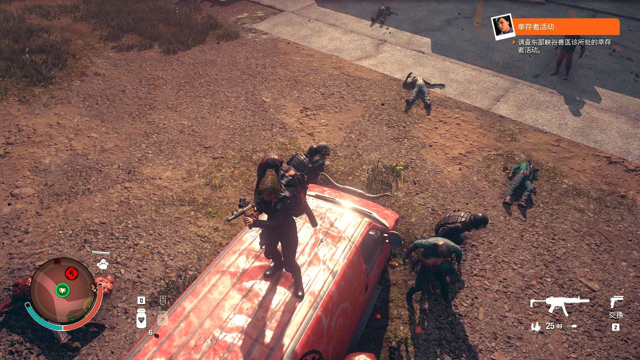 其二:车顶射击术。玩家站在没有损毁的汽车车顶时,丧尸只会站在原地咆哮。这时候有远程武器的话,欸嘿嘿