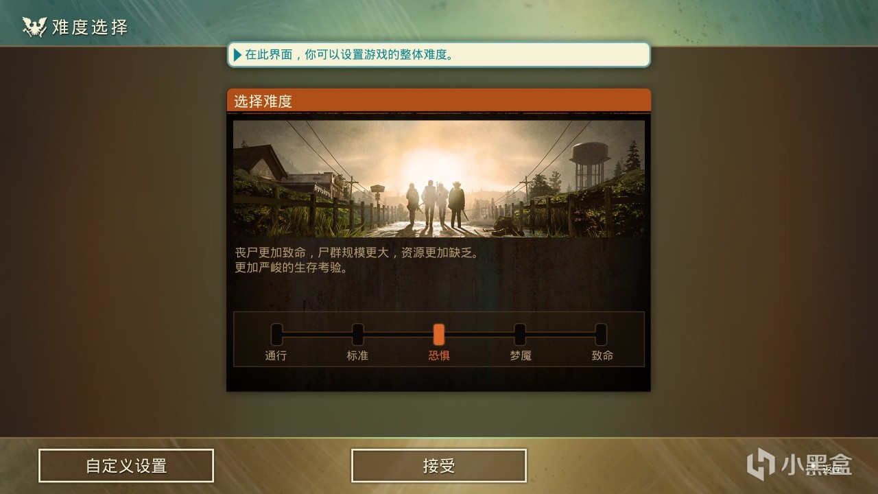 难度方面,前四个区别不大。如果对自己不太有自信的话,可以从第二个难度——标准开始。第五个难度——致命和前面四个的区别相当之大。在这个难度中,丧尸都是自带感染效果的,摸一下角色濒死,再摸一下当场去世而致命难度会在脸上刷出来类似三狗屠神阵、三尖叫等一系列玩家杀手。如果难度四玩腻了,推荐玩这个难度。