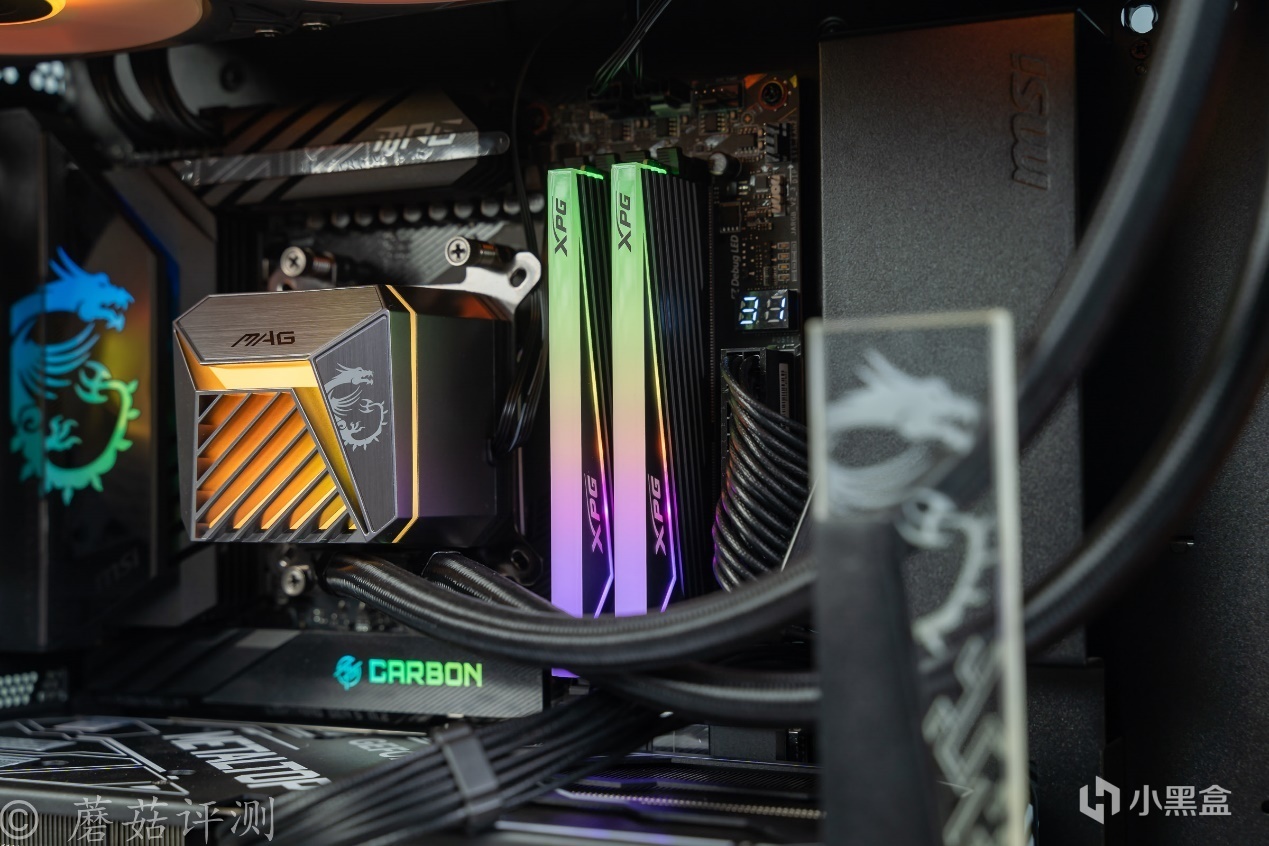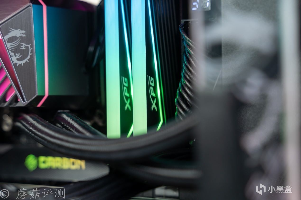 ▼稍微側過一些,整體的視覺觀感也非常不錯。內存的金屬馬甲和主板整體融合到一起,讓內存頂部的RGB燈帶有些懸浮感。