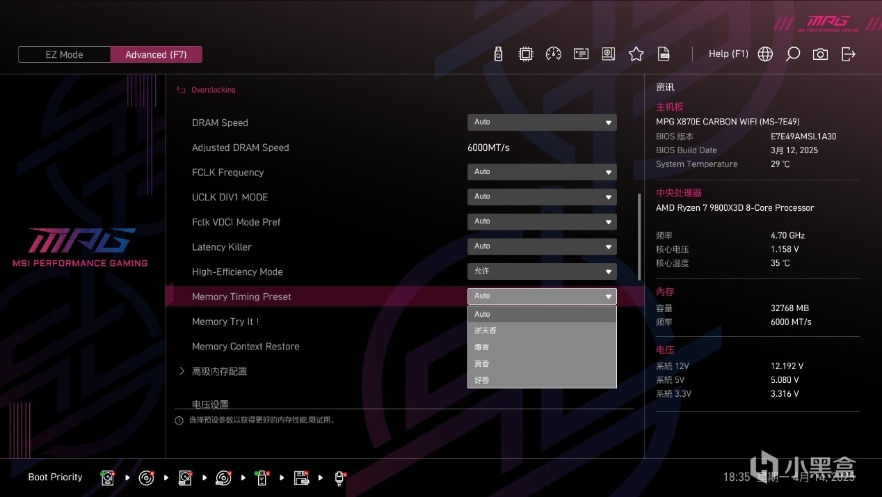 ▼微星這塊X870E暗黑主板,BIOS內有專門的內存時序優化選項,這裏蘑菇直接選擇“逆天香”,看看效果。