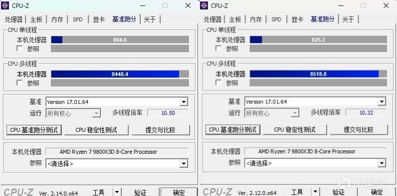 ▼簡單跑個CPU-Z的性能測試,單核得分從804.6提升到825.3,提升約2.5%。多核得分從8448.4,提升到8518.8,提升約0.8%。提升幅度雖然不大,但依然明顯。