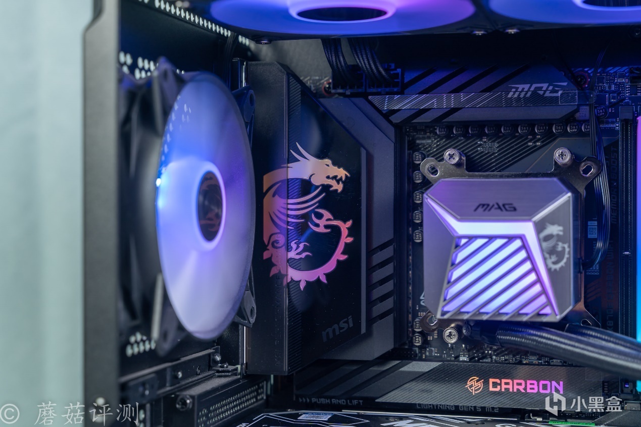 ▼主板左側供電散熱件的表面有微星經典的龍標LOGO,支持ARGB燈效,支持主板同步。