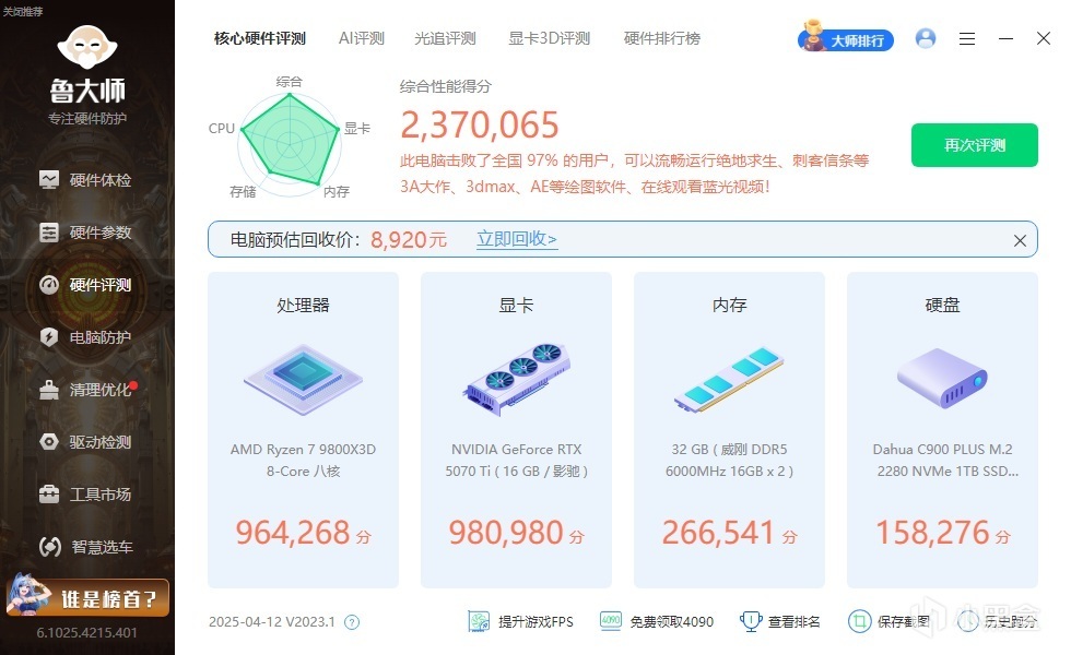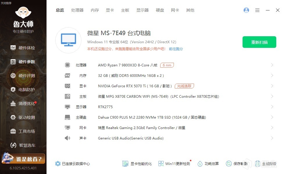▼整機配置一覽,處理器是9800X3D,主板是微星的X870E暗黑,顯卡是影馳的RTX5070Ti金屬大師黑金版OC。
