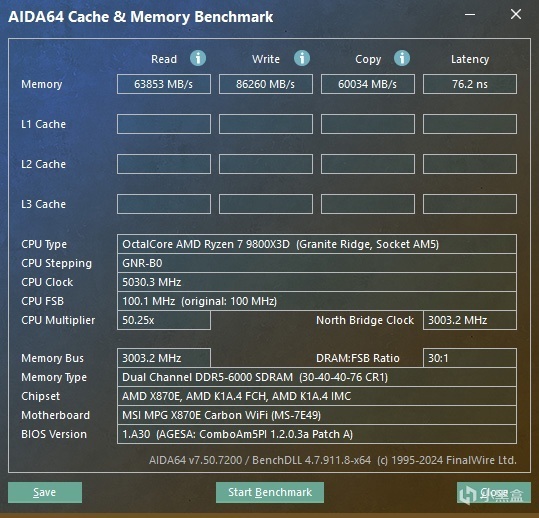 ▼內存的讀取速度在63853MB/s、寫入速度在86260MB/s、複製60034MB/s,延遲76.2ns,表現提升明顯。