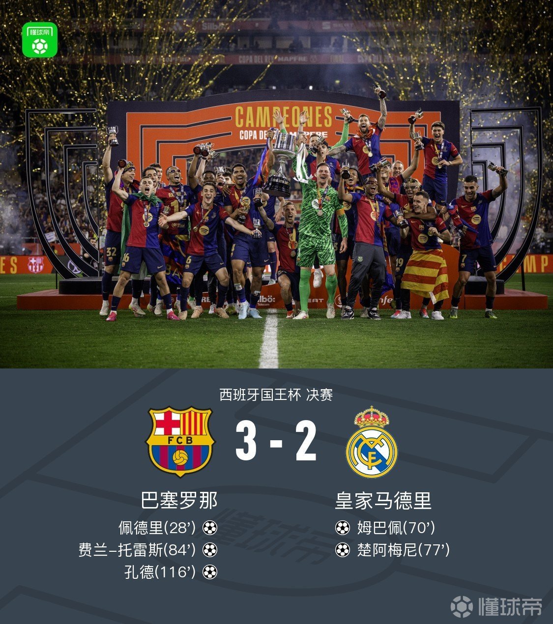 最終比分3:2,巴薩加時賽逆轉絕殺再次拿下國家德比(呂迪格你終於喫到紅牌了啊),捧起隊史第32座國王杯。