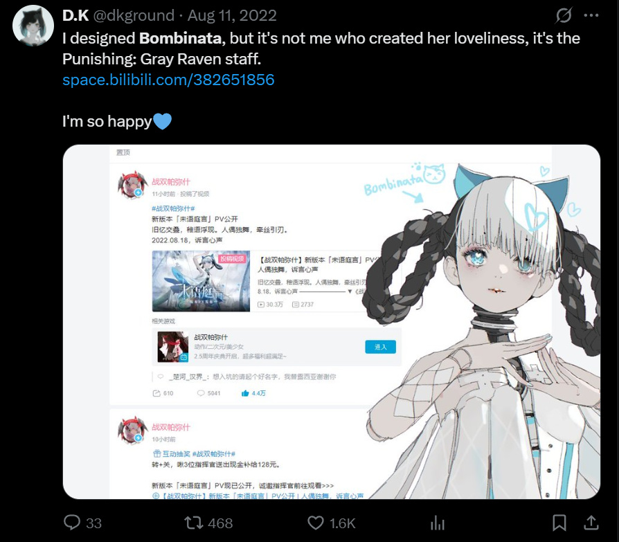不難想象,憑藉這兩大核心優勢內容的積累,此次《鬼泣5》聯動有望爲《戰雙》再次創造一輪爆點。還記得《尼爾》原畫師D.K曾發帖表示:我設計了邦比娜塔,但卻是《戰雙》讓她變得更加可愛。來自“偶像團隊”專業人士的認可,大概是對《戰雙》團隊創作能力的最高褒獎了。