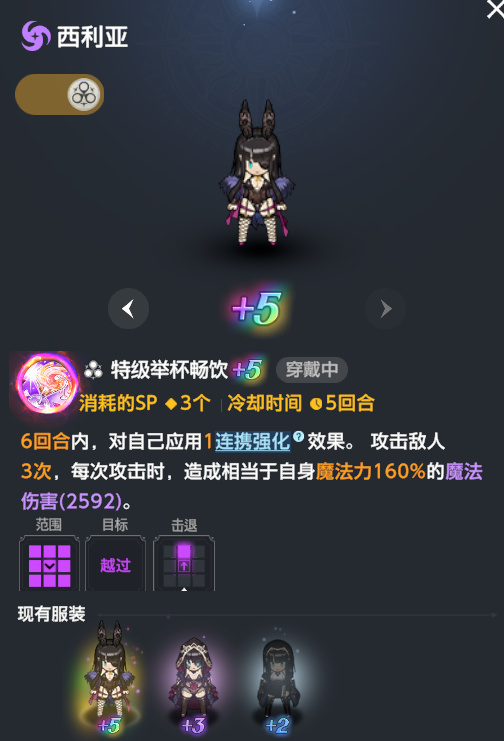 西利亞需核心服裝兔女郎,前置條件觸發連鎖加倍,且三個服裝齊全保證高連鎖循環。