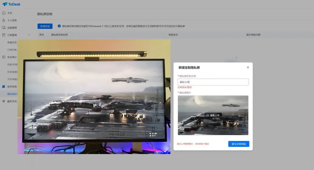 ToDesk支持在手機端或PC端菜單選項中開啓隱私屏。開啓後,被控端會進入默認隱私屏界面,他人無法查看桌面內容,同時也可在ToDesk官網登錄賬號進入個人中心進行自定義隱私屏畫面,將隱私屏更換爲任何你想要的壁紙。