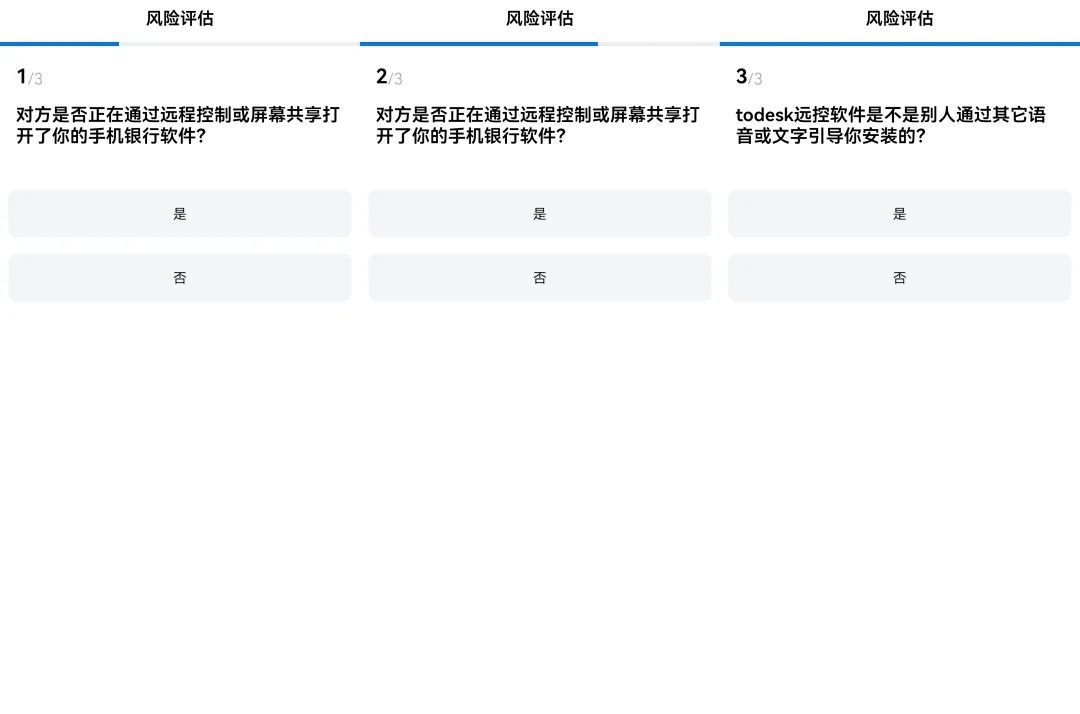 ToDesk的金融賬戶保護功能總結爲三個方面,一是在遠控發起時,被控手機端會彈出反詐警告窗口並進行風險評估,可提高被控用戶的警覺性及安全防護意識。