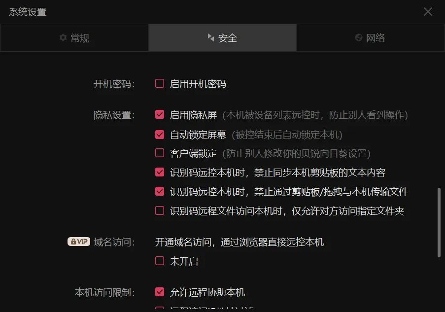 不過向日葵可以在設備被遠控時禁止同步剪貼板文本、禁止通過剪貼板/拖拽與設備傳輸文件、被控時允許對方訪問指定文件夾等,但是設置的校驗和保護還不夠豐富,類似ToDesk的強隱私模式、非同賬號連接自動鎖定客戶端等都沒看到。