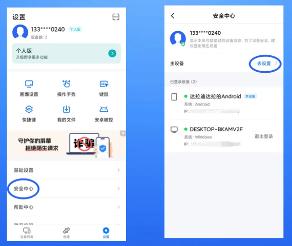 其中,主設備的綁定和更換也很簡便,可以在ToDesk APP內打開設置-點擊安全中心,找到主設備後點擊去設置,收到短信驗證碼後即可成功綁定。更換主設備也是在新手機內登錄原賬號的設置裏面修改。