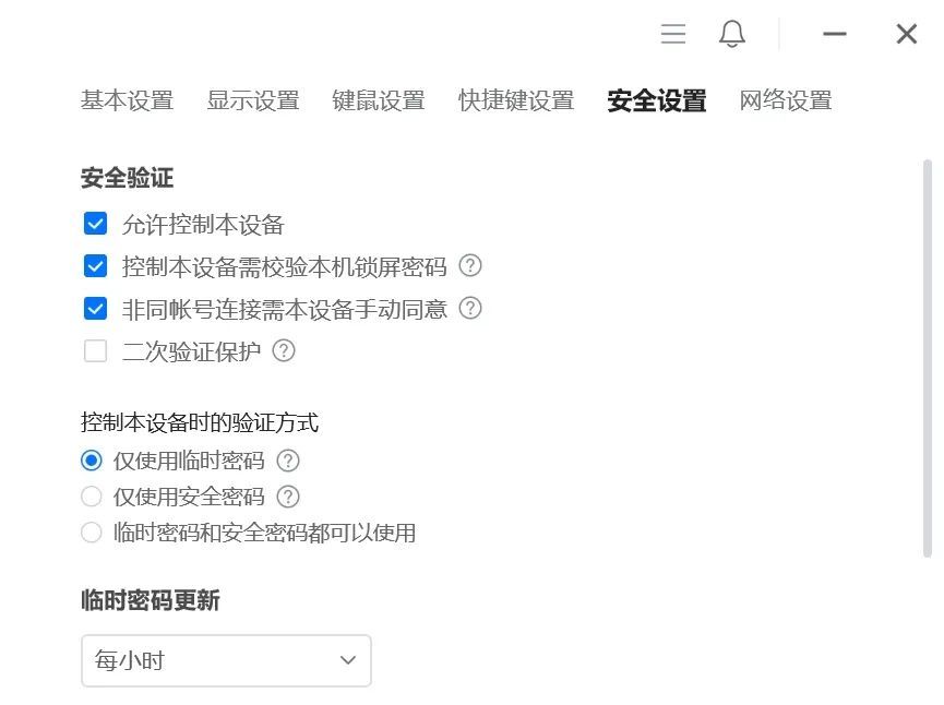 必須在電腦端的安全設置裏勾選“允許控制本設備”才能啓用遠控功能,同時還可勾選“控制本設備需校驗鎖屏密碼”“非同賬號連接需本設備手動同意”,這樣再可以增加多道防護。控制端與被控端賬號不一致的情況下,支持開啓自動鎖定客戶端。