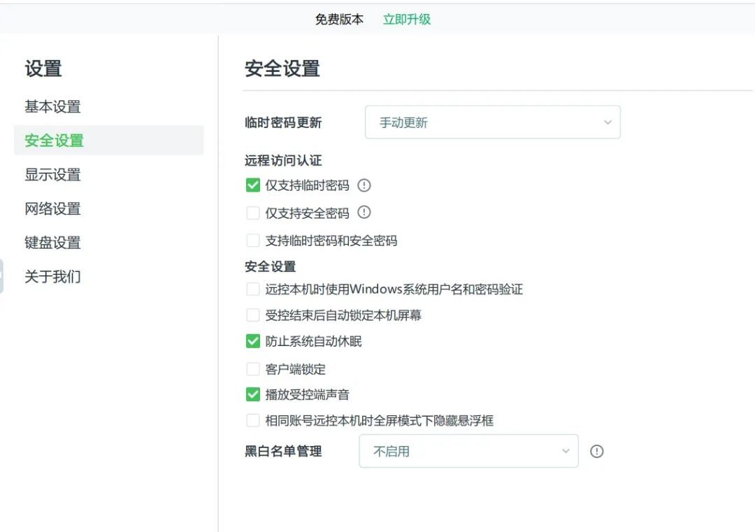 安全設置方面,遠程訪問認證可以選擇支持臨時密碼或安全密碼,或兩者都支持。然後提供受控結束自動鎖屏、遠控啓用電腦系統用戶名和密碼驗證等選項,頁面排版幾乎和ToDesk的安全設置一模一樣,但實際包含的安全功能遠不如ToDesk豐富。