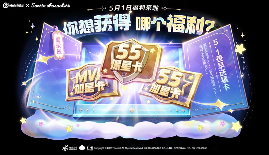 5月1日登錄可領取阿古朵聯動皮膚-布丁狗之約及妲己聯動星史詩-美樂蒂之語(需累計簽到完成任務)。
