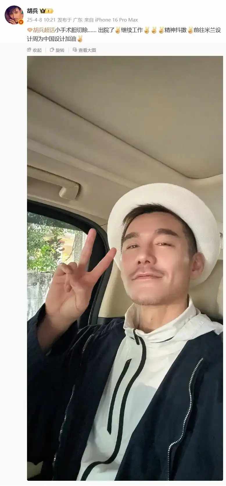 胡兵:2025年4月8日,54歲的胡兵完成膽囊切除手術後出院,術後迅速投入工作,並稱“小手術”不影響狀態。