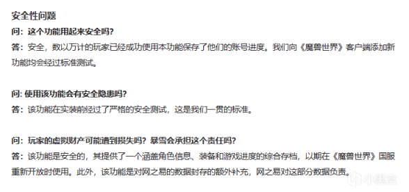 答:該功能是安全的,其提供了一個涵蓋角色信息、裝備和遊戲進度的綜合存檔,以期在《魔獸世界》國服重新開放時使用。此外,該功能是對網之易的數據封存的額外補充,網之易對這部分數據負責。