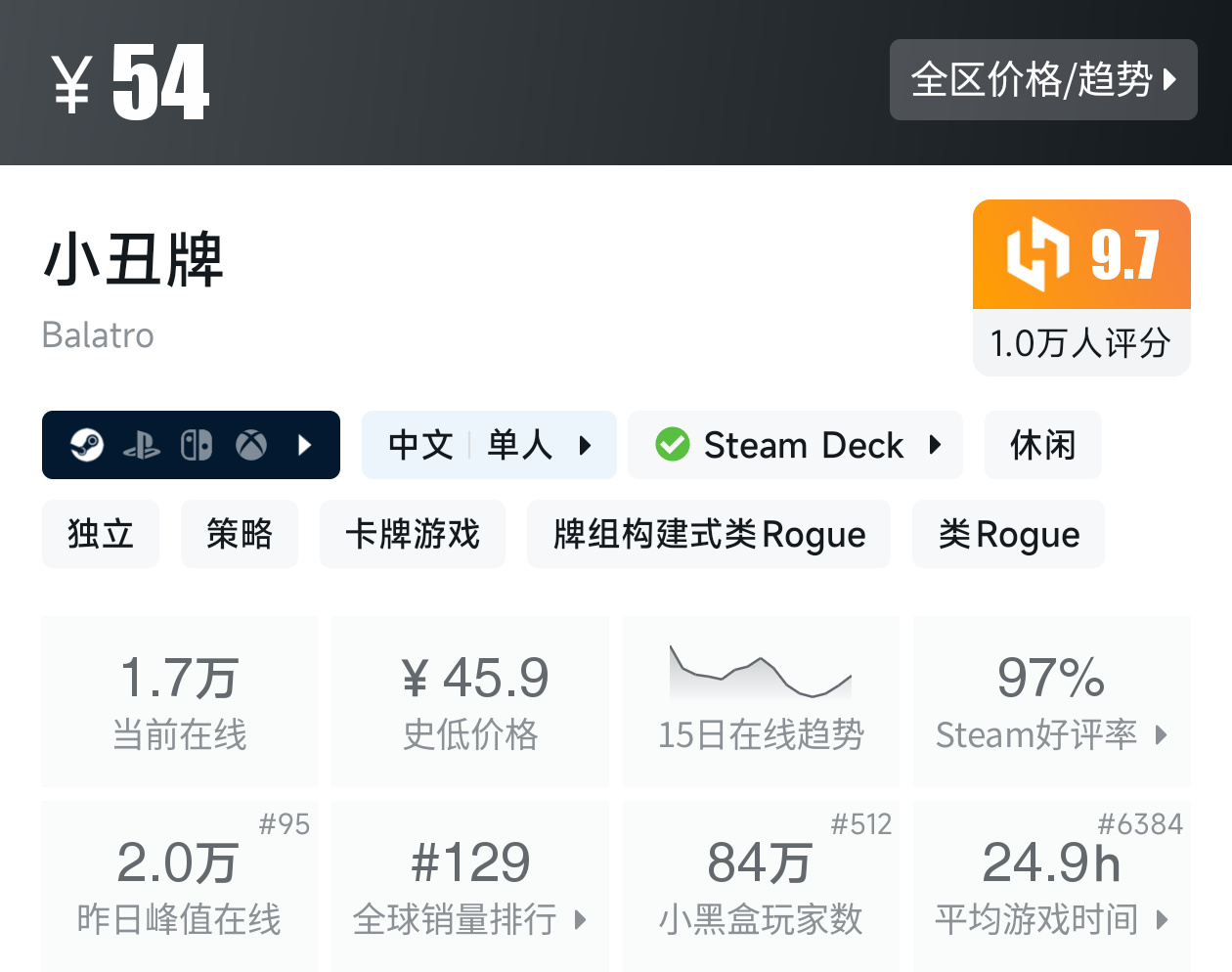 去年的TGA和金摇杆的年度最佳独立游戏,一上线就疯狂席卷全网,以普通的扑克牌来构筑自己的卡牌,加上不同的小丑牌和各种功能牌来达成需要的点数,让人十分上头。