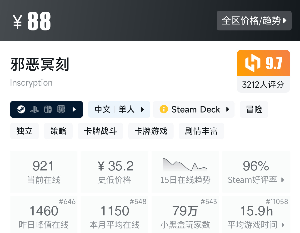 一款十分优秀的卡牌肉鸽游戏,经典的卡牌构建式战斗,独具一格的剧情表现方式,精细的画面质量,超高的游戏精度以及那若隐若现的恐怖压抑氛围,让人精神紧绷却又十分爽快。