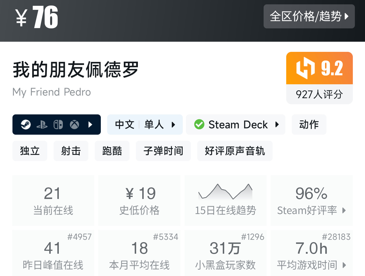 我的朋友佩德罗是一款动作和射击结合的跑酷游戏,游戏采用闯关的形式来游玩,通过子弹时间来消灭所有敌人,前往下一关,剧情一般般,但游戏玩法挺有趣的,喜欢的可以入手一波。