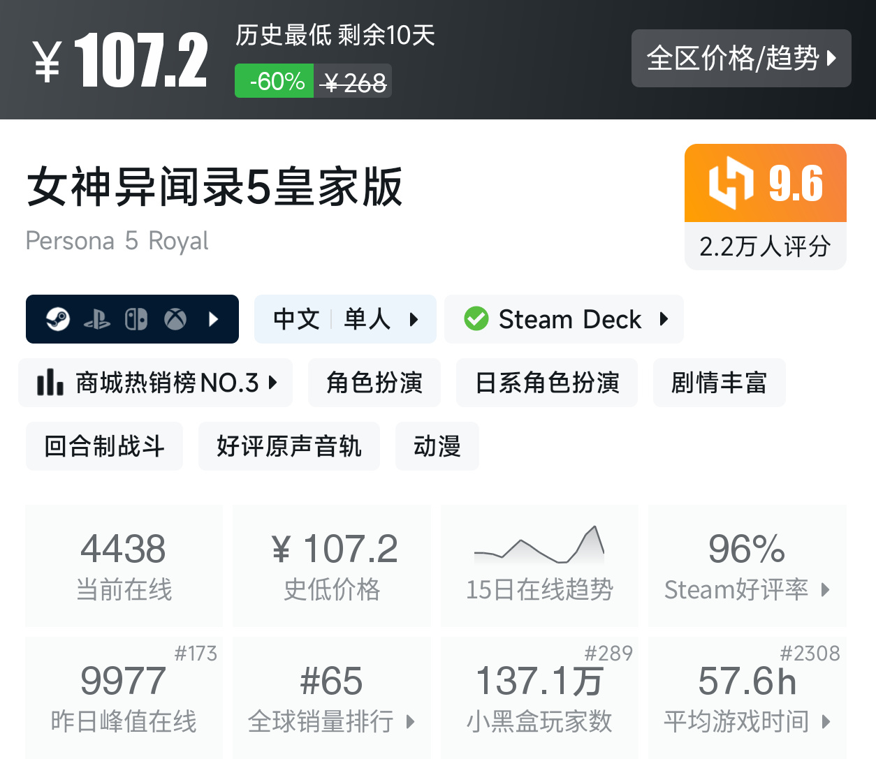 相信大家都听过天字第一P5R,说的就是这一款游戏,作为一款回合制的JRPG游戏,却在玩法上融入了迷宫探索和解谜系统,加上JRPG经典的重复刷怪,导致流程又臭又长,第一次接触这类游戏的小伙伴估计十分劝退,如果你是喜欢二次元以及JRPG的小伙伴,这款游戏可以直接无脑入,绝对不亏
