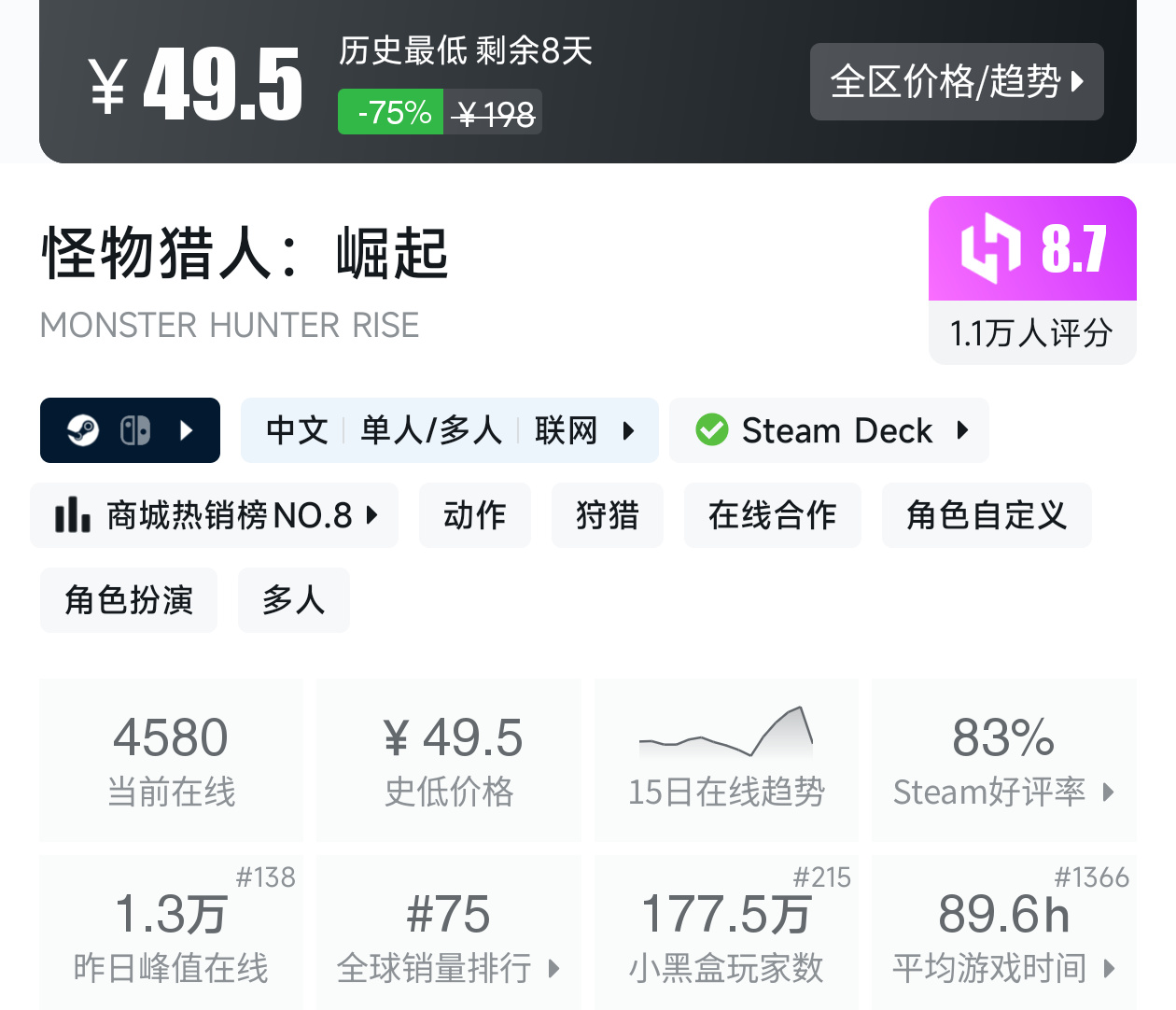 怪猎系列作为动作天尊卡普空的热销系列之一,游戏的狩猎系统和动作战斗的结合带来了不同的爽感,两部都有着不同的游戏体验,世界慢节奏,崛起战斗爽,新入手的小伙伴可以根据喜好入手