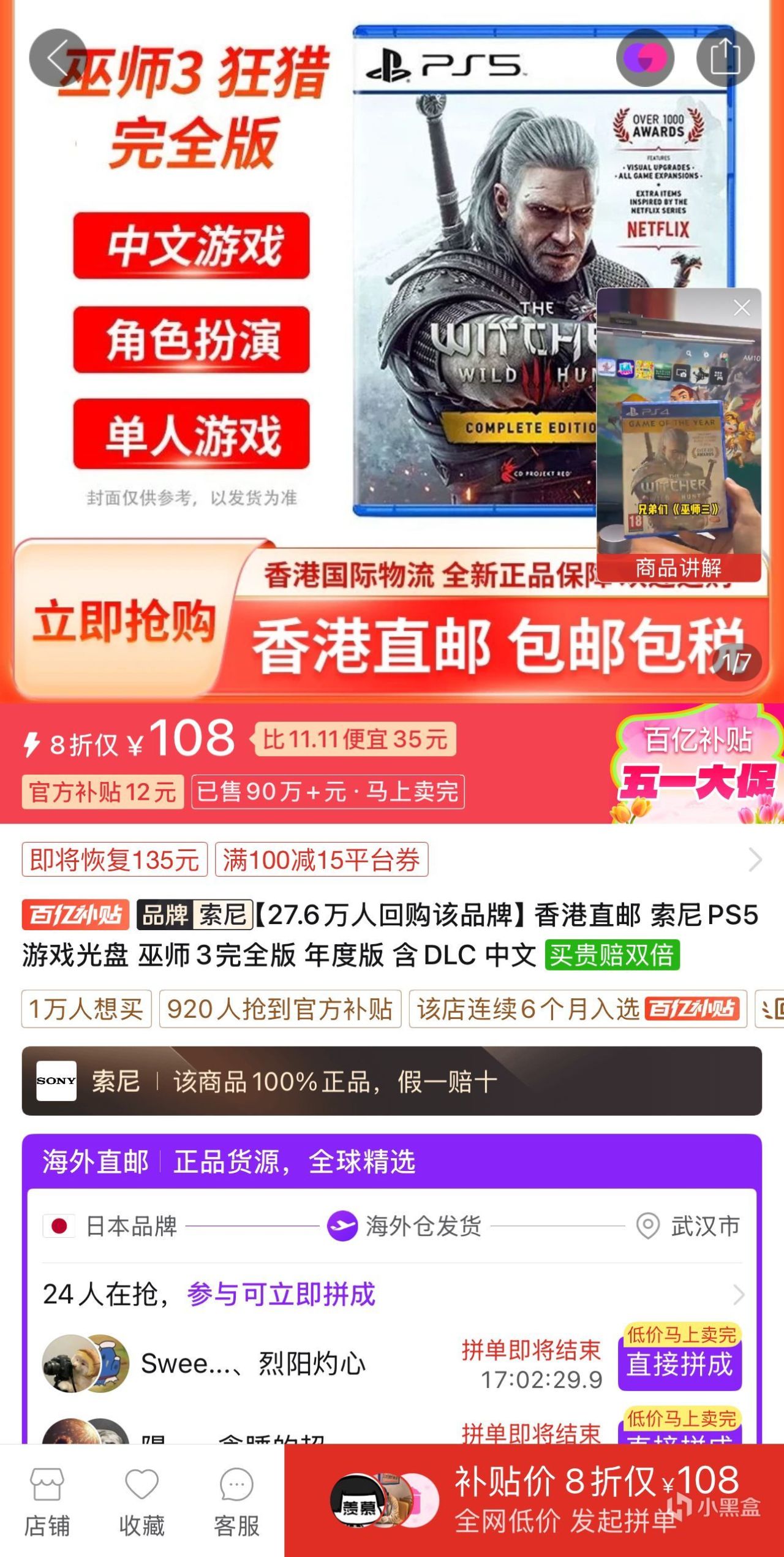 3.PS5游戏《巫师3狂猎:完全版》港版中文108元全新包邮,PS5完全版包含游戏本体和全部DLC,跟之前PS4《巫师3狂猎:年度版》游戏内容是一样的,仅推荐给之前没有买PS4完全版的PS5新人玩家或者是收藏实体碟玩家。