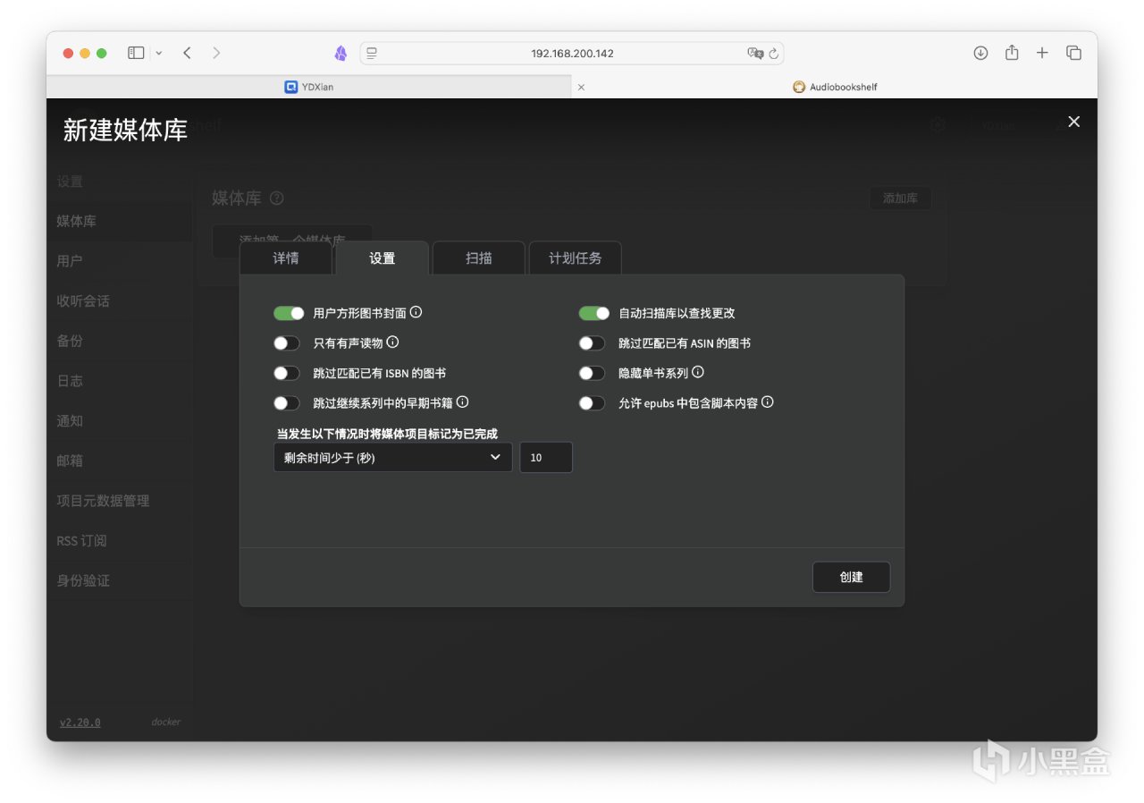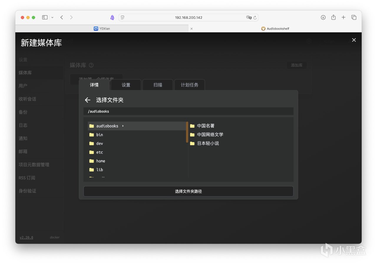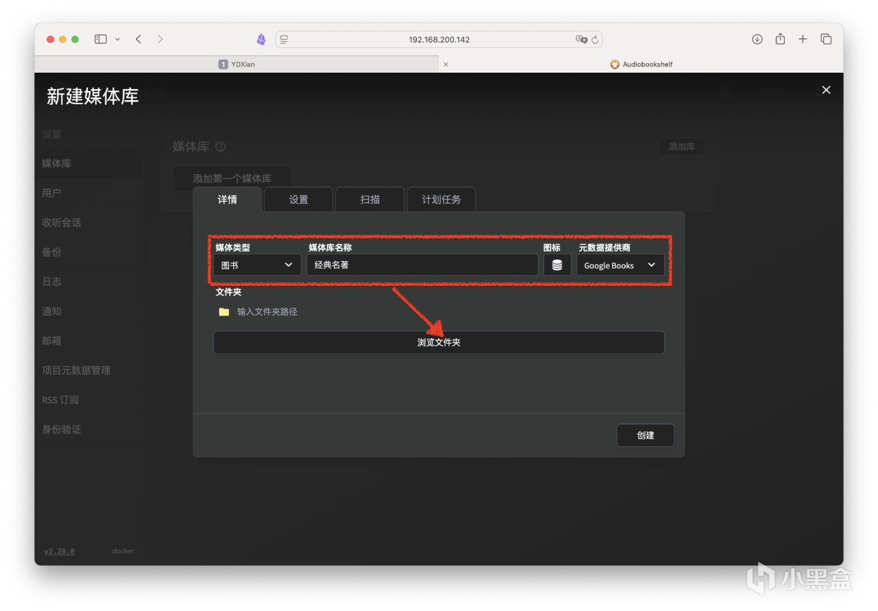 回到主頁後,點擊左側欄的媒體庫,添加第一個媒體庫。媒體類型可選擇圖書或播客,名稱和圖標可自定義,元數據提供商有很多選擇。接着點擊瀏覽文件夾。如果輕車熟路,也可以手動輸入路徑~