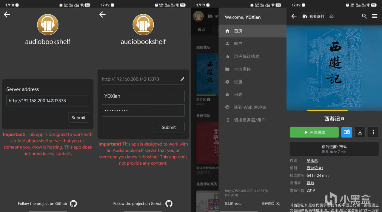 這次要介紹的就是——Audiobookshelf,一個自託管的開源免費有聲書媒體服務器項目,功能強大、界面優雅、部署簡單,對於相聲、評書、有聲小說、播客等都具備很好的支持。具備多端同步播放、章節記憶、速度調節、家人多賬戶共享、睡眠定時等一系列實用功能,還包含了對播客、訂閱的一站式自動化管理,堪稱有聲書界的 Jellyfin。他還提供了安卓和IOS的官方APP,體驗更是沒得說。