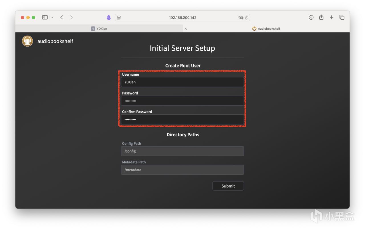 創建root賬戶,輸入密碼、再次確認密碼,點擊右下角submit即可。