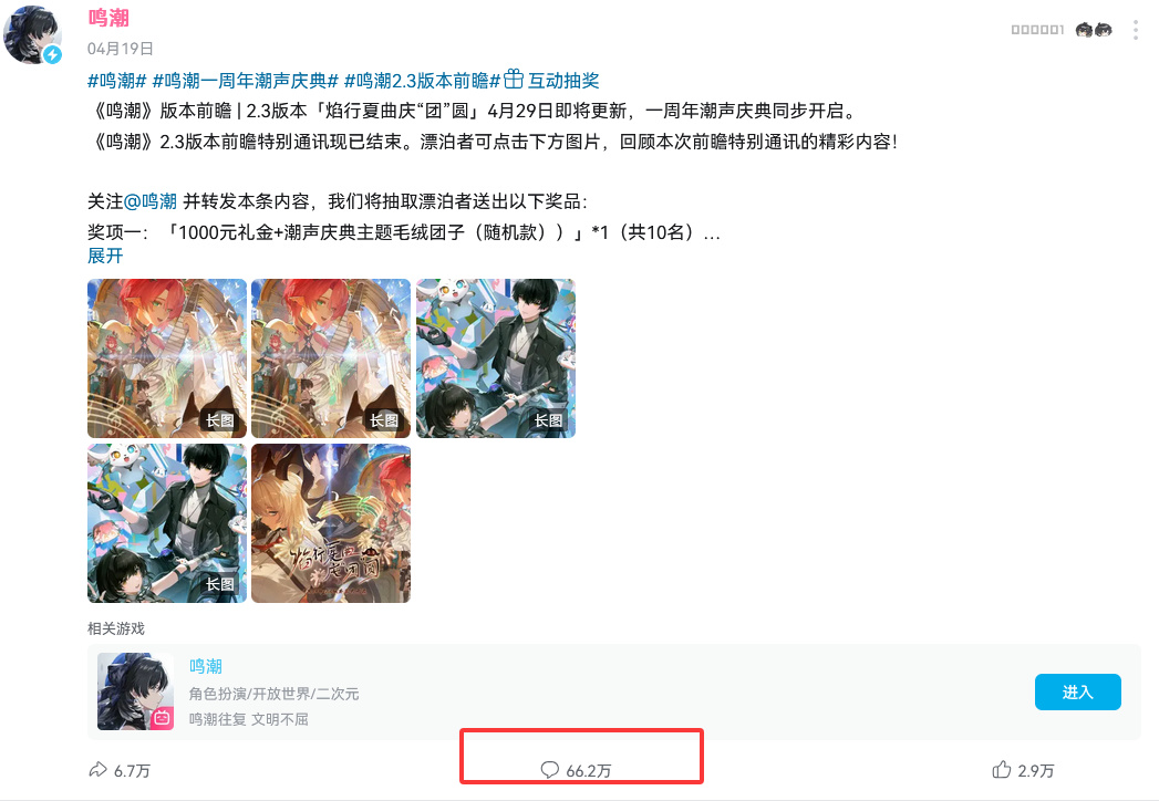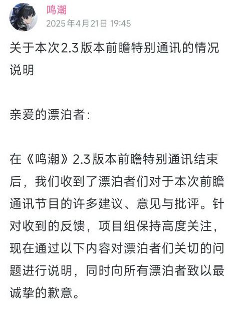庫洛就像陀螺一樣,接下來請見證庫洛的逆風翻盤——怎麼逆風的你別問,2.3直播作爲鳴潮整年週年慶,不僅福利很少,沒有新地圖,松倫還一直在“難道說?”不停的讓玩家期待落空,引起了衆怒,於是被炎上了六十萬樓,兩天後庫洛發佈道歉聲明,說是由於產能安排導致節目內容編排不當、表達方式存在明顯問題,道歉後補償30抽,角色武器限定各10抽,普池10抽,大夥對這個補償滿意不?