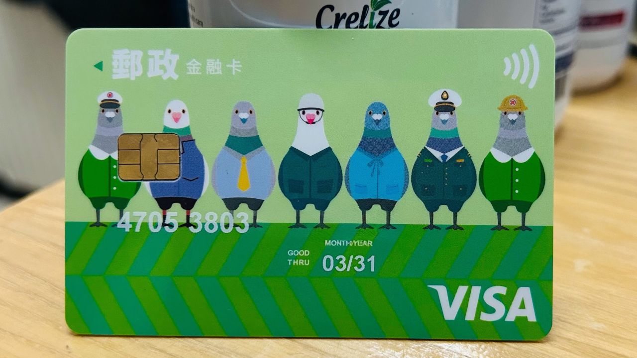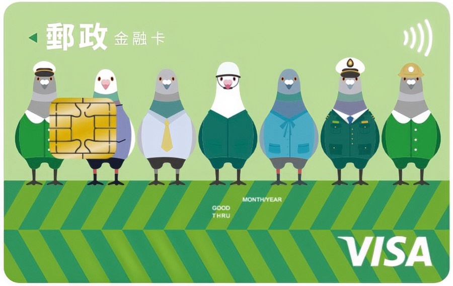 圖4、5是晶片金融卡換髮的Visa晶片金融卡,7只各着郵務工裝的小鴿子排排站,翠綠的背景不僅強調了主題色,更有一分更靜謐的安定。