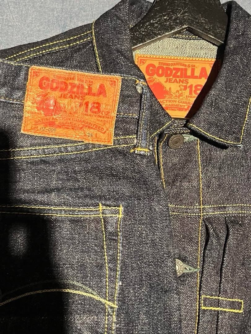 我最爱的哥斯拉联名套装,模仿哥斯拉皮肤制作的粗糙面料、和哥斯拉刺绣装饰。当时还穿着去看哥斯拉大战金刚来着。