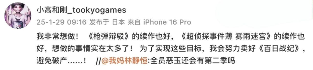在玩家問到彈丸論破系列,以及之前很多未徹底填完的坑是否會完結的問題的時候,他就提到了當時還只是小範圍傳播的新作《百日戰紀》,因爲本作投入的超高成本,對於他的團隊來說,失敗其實就相當於面臨解散的危機。