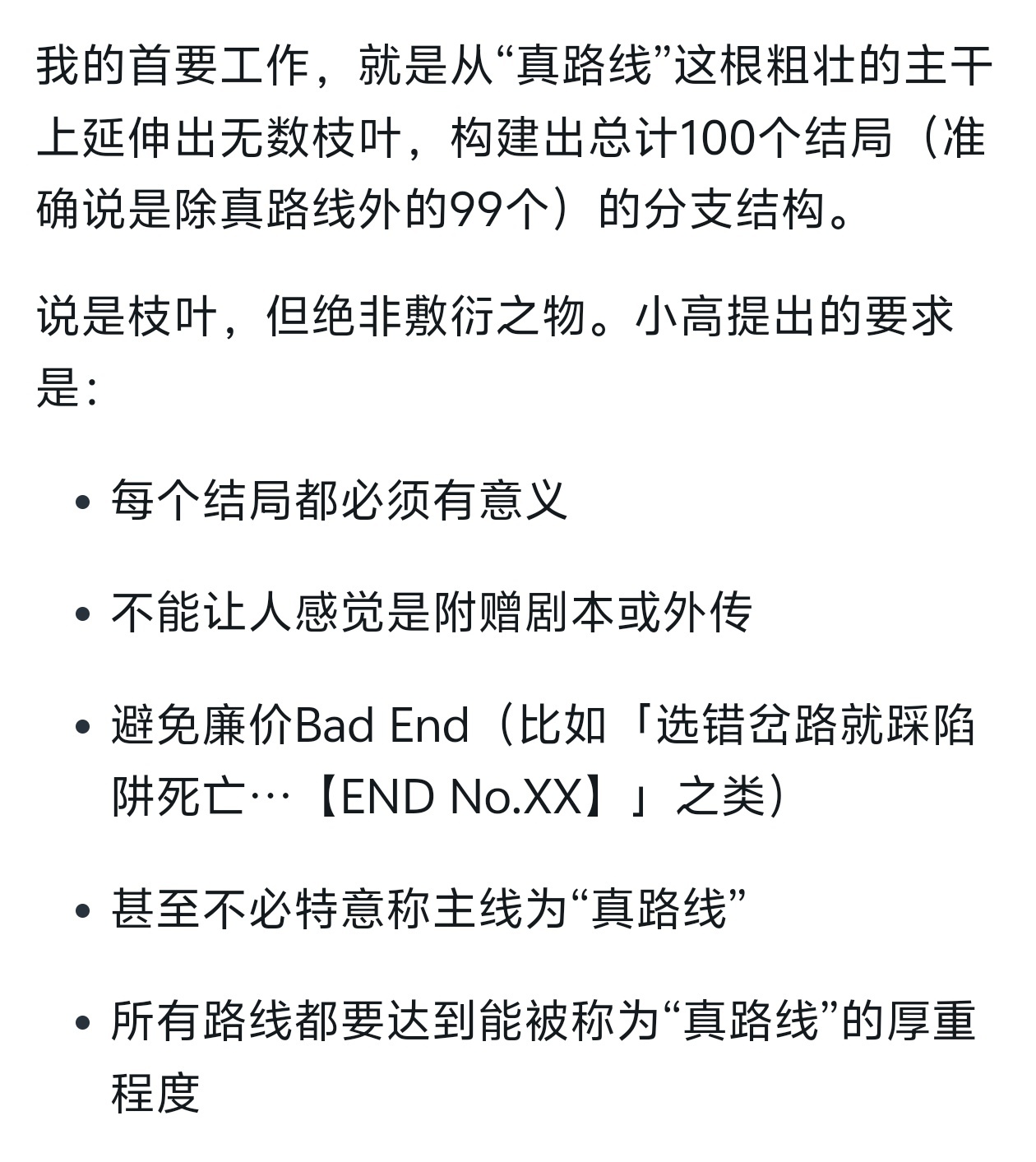 一百個結局的設計,其實並不是玩家想的那樣在一根主樹幹的旁邊長出一些沒什麼意義的小樹枝小樹葉,打越在採訪中甚至專門談到了自己製作的要求