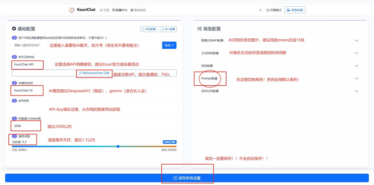 现在所有主要内容已经配置完啦可以使用了,一定一定记得点底部的保存所有设置!!否则不会改成新角色的!!