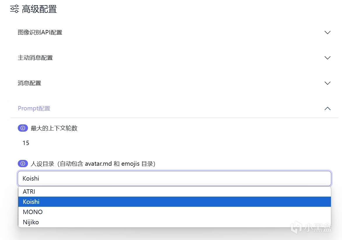 点开右侧高级配置下的Promt配置,打开人设目录即可选择你想用的角色