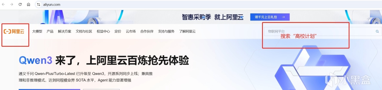 接下来默认你是大学生,进入阿里云官网,搜索“高校计划”(如自购云服务器则跳过这一小段)