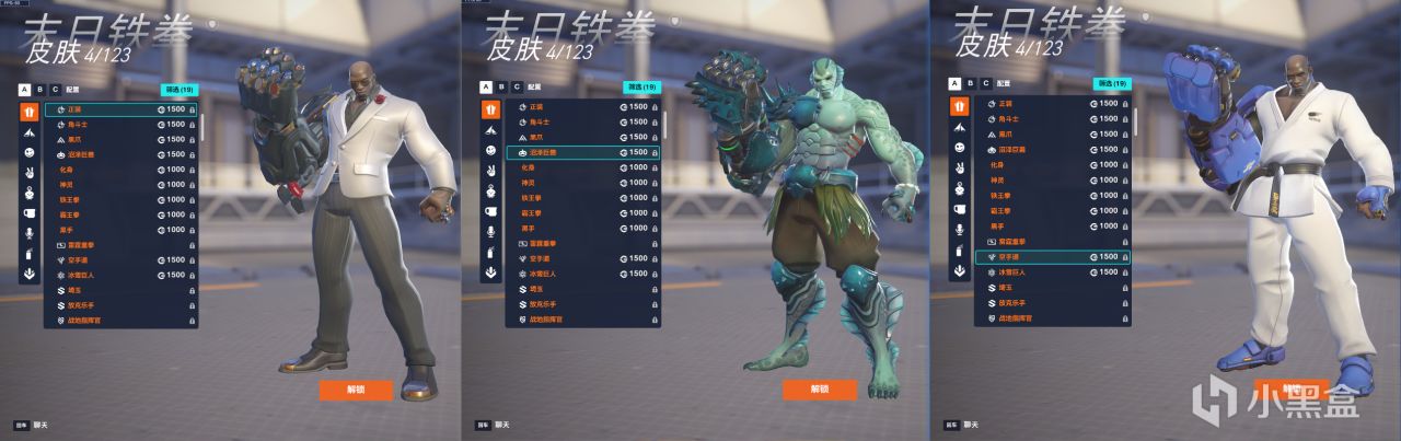 這三個基本就是鐵拳畢業皮了,mzm喜歡雷霆重拳和正裝,屁王是魚人,卜天才愛用空手道
