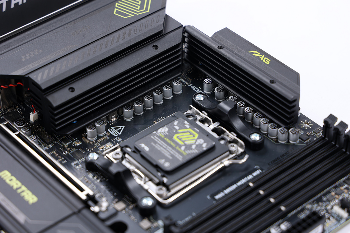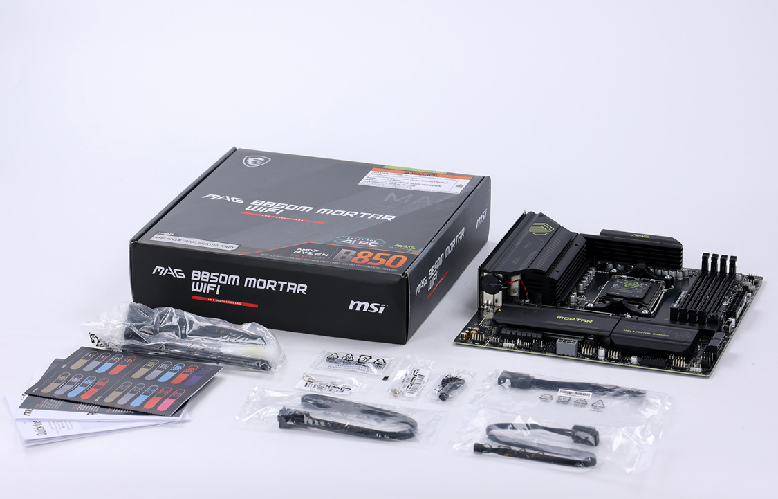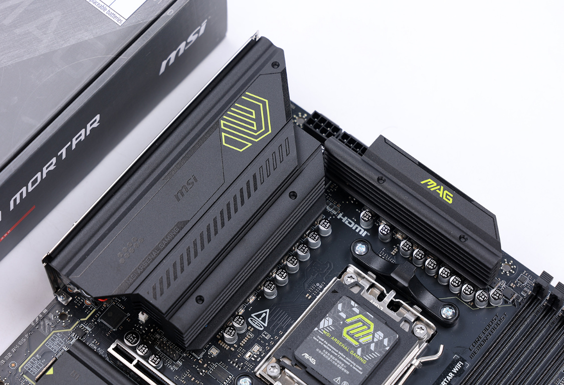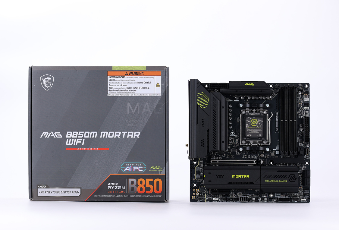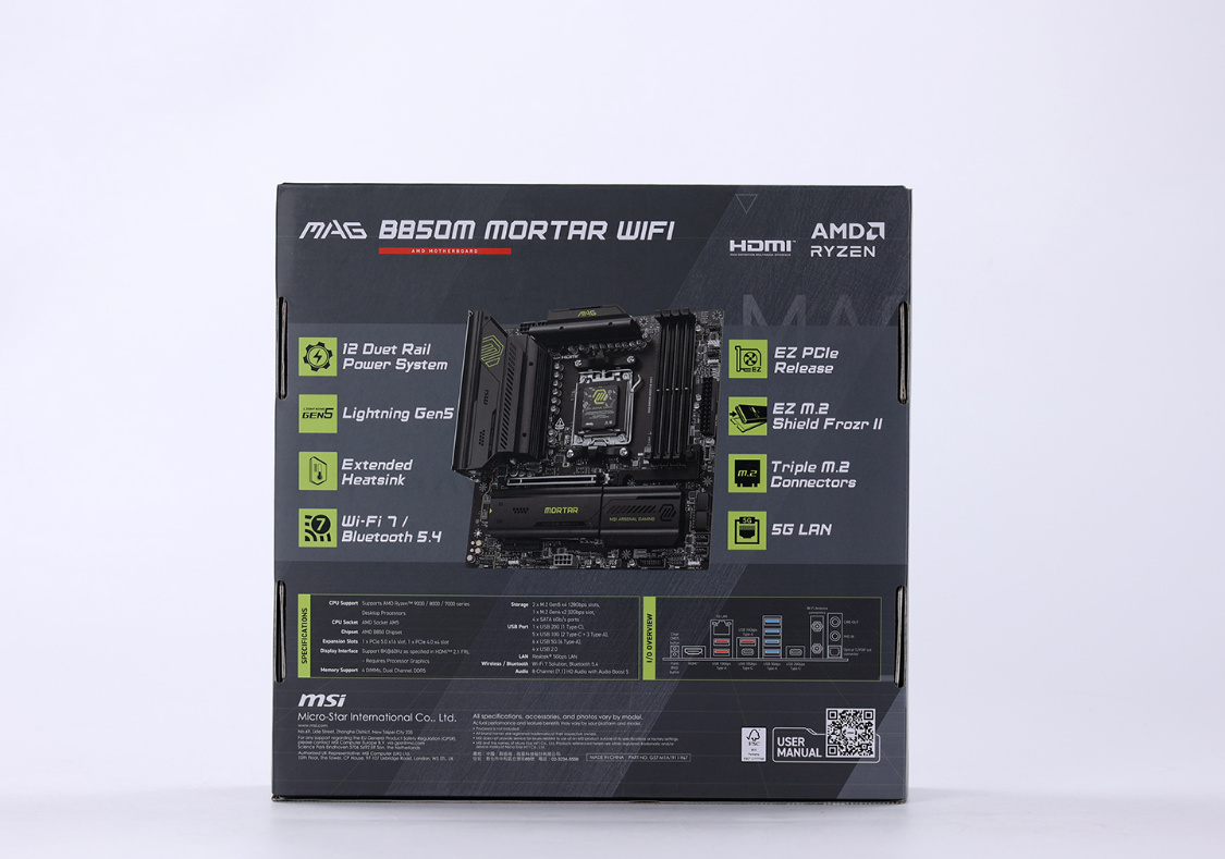 從全白到黑色PCB配銀白金屬裝甲再到當下全黑配色,咱應該也算得上是“迫擊炮”系列的忠實擁泵了。主板採用M-ATX規格,黑色PCB板上覆蓋了大面積暗黑風格金屬散熱裝甲,再搭配上黃綠配色的MAG系列LOGO和亮黑色的機甲花紋點綴,辨識度高。搭載B850芯片組,支持銳龍7000/8000G/9000系列處理器。