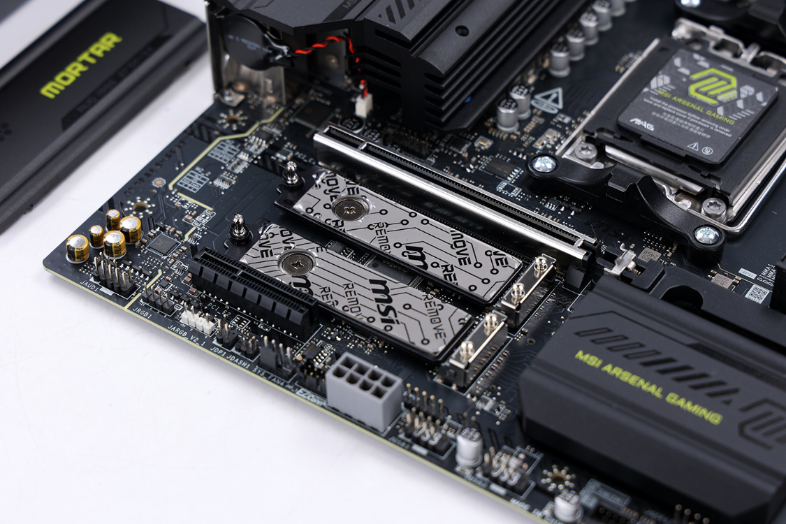 主板提供了2條PCIe插槽。近CPU側的爲PCIe X16規格,CPU直連設計,最高支持PCIe 5.0 x16的傳輸速率,並且這條插槽還支持微星最新的顯卡快拆功能,玩家只需按下一次按鈕,即可使PCIE卡扣保持常開或常閉,按鈕旁邊的提示圖標也可以幫助玩家快速瞭解按鈕當前的開合狀態,而插槽外部的金屬馬甲則可以提高PCIe插槽的抗變形能力,讓插槽可以更加穩固。另一個PCIe插槽則爲PCIe X4規格,基於芯片組傳輸數據,最高支持PCIe 4.0 x4的傳輸速率。