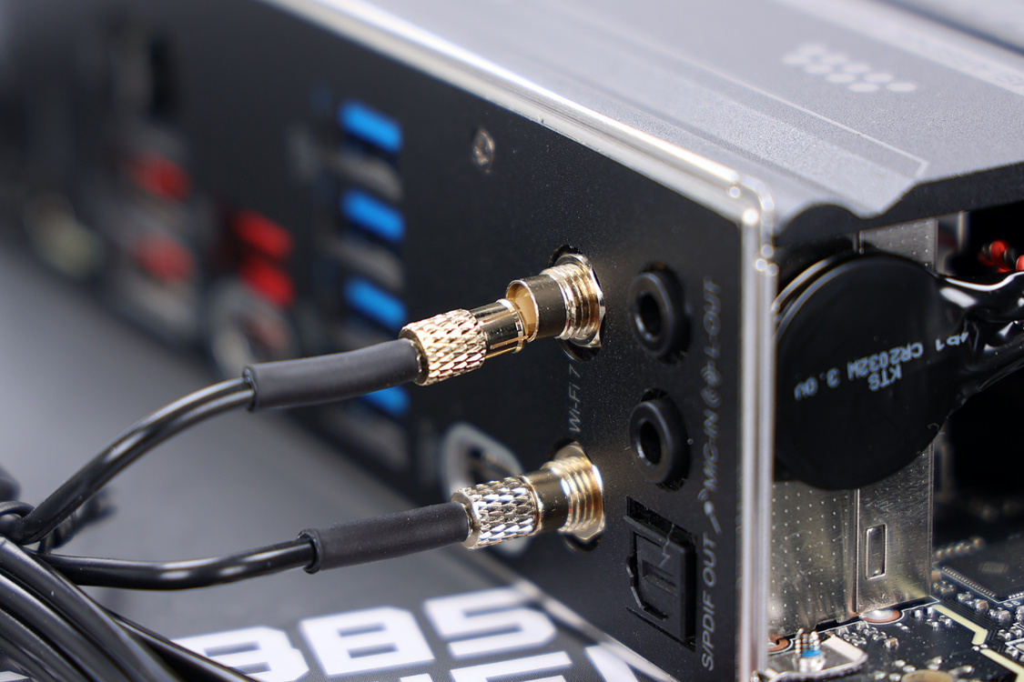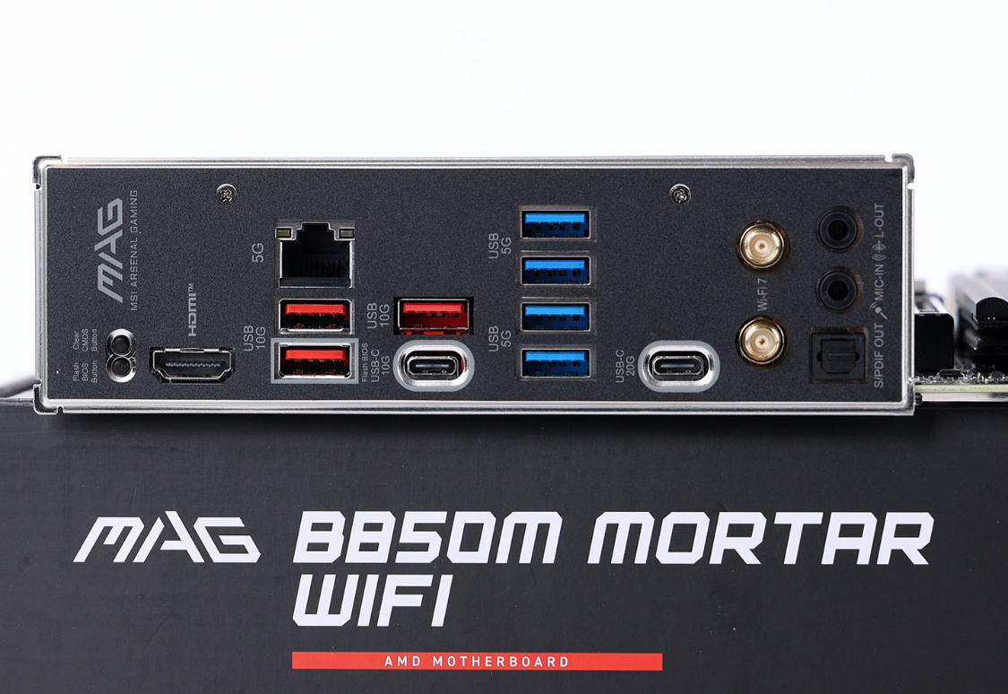 一體式後置I/O面板,全黑配色,主板從左至右依次提供了CMOS 清除按鈕*1、無U升級BIOS的Flash BIOS按鈕*1、HDMI 2.1視頻接口*1、USB 10Gbps Type-A數據接口*3(紅色)、5G LAN有線網絡接口*1、USB 10Gbps Type-C數據接口*1、USB 5Gbps Type-A數據接口*4(藍色)、USB 20Gbps Type-C接口*1、支持WIFI 7和藍牙5.4無線傳輸協議的WIFI天線接口*1以及1組包含S/PDIF光纖數字音頻和3.5mm圓孔的音頻接口。